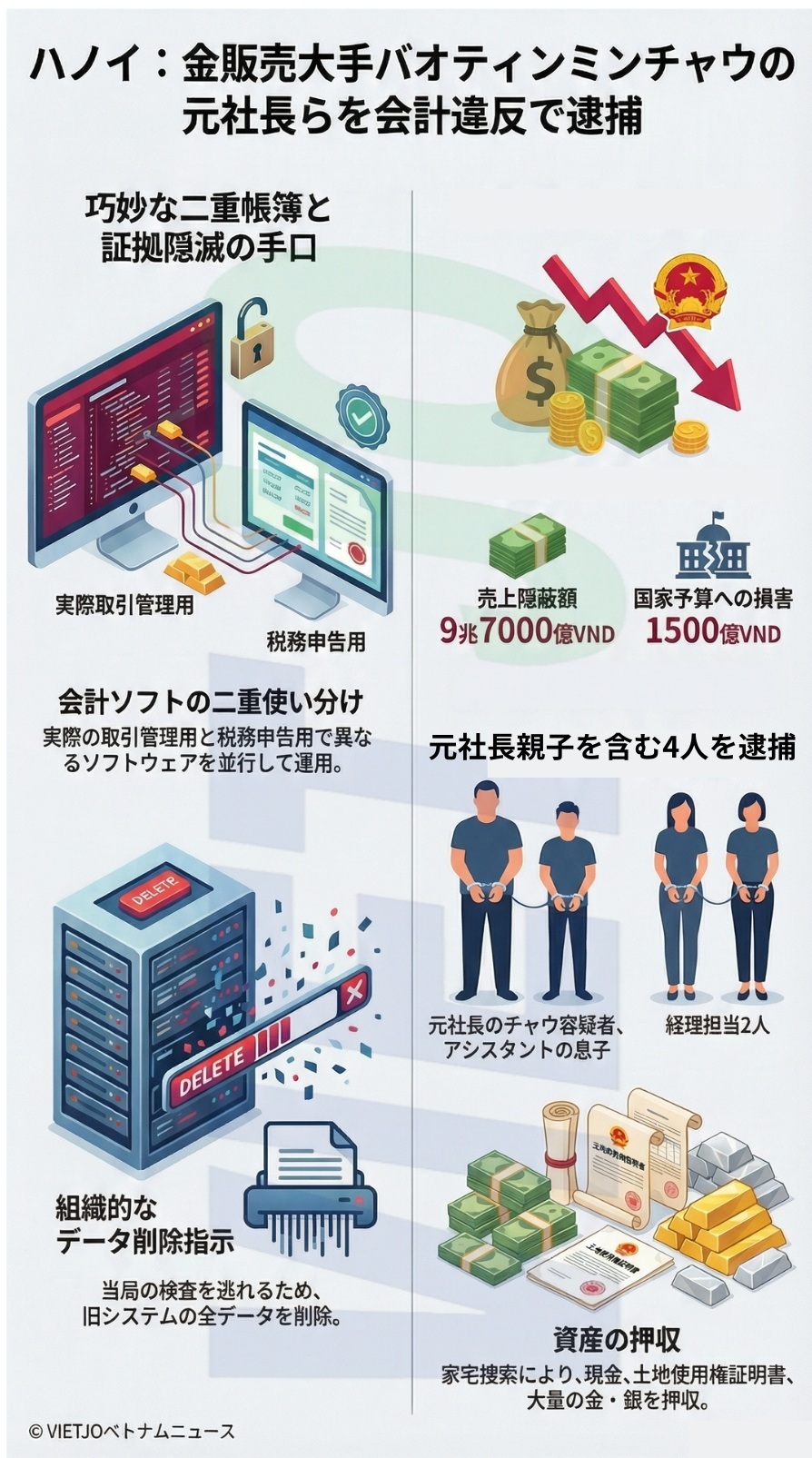 ハノイ市警察は、金(ゴールド)の製造・販売を手掛けるバオティンミンチャウ(Bao Tin Minh Chau)社の元社長であるブー・ミン・チャウ容疑者(男)と同社の元幹部らを会計規定違反の容疑で起訴した。容疑者らは二重帳簿を作成して売上高約9兆7000億VND(約580億円)を隠蔽し、国家予算に約1500億VND(約9億円)の損害を与えたとされる。