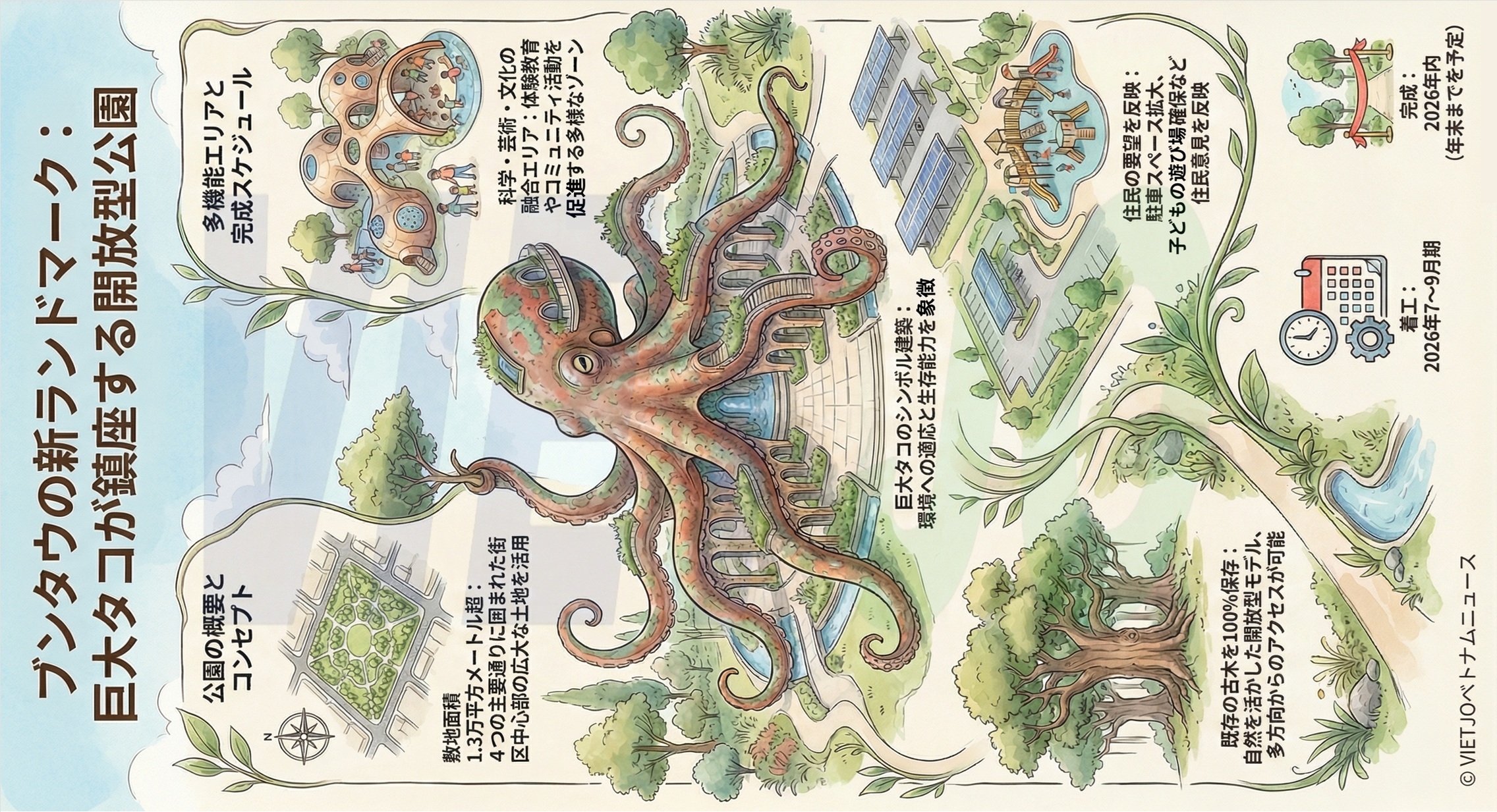 ホーチミン市ブンタウ街区(旧バリア・ブンタウ省ブンタウ市)人民委員会は8日、同街区のトンニャット(Thong Nhat)通り21番地における公園建設計画について、住民からの意見聴取を行う会議を開催した。公園の中央には、環境への適応や生存能力を象徴する巨大な「タコ」をモチーフにした建物が建設される予定だ。