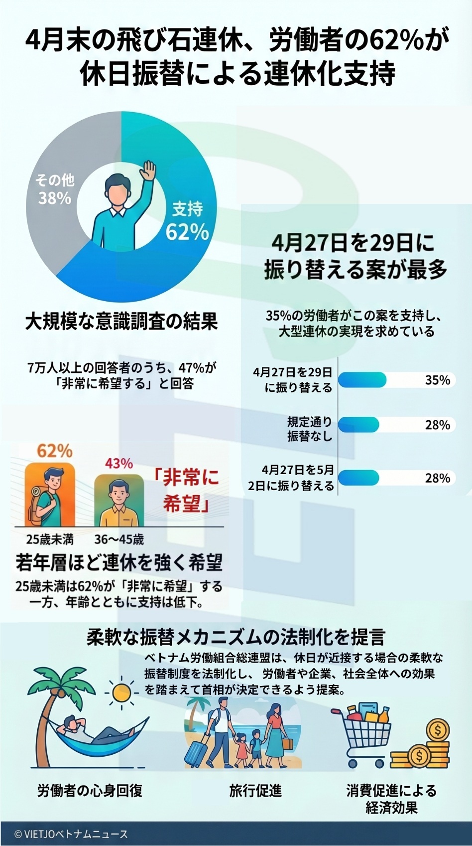 しかし、この場合、4月30日の南部解放記念日との間に2日間の平日を挟むことになり、休日が細切れになってしまう。同連盟は、柔軟な休日の振替により連休が実現すれば、労働者の心身の回復だけでなく、旅行や消費の促進による経済や社会へのプラスの影響も期待できると指摘している。
