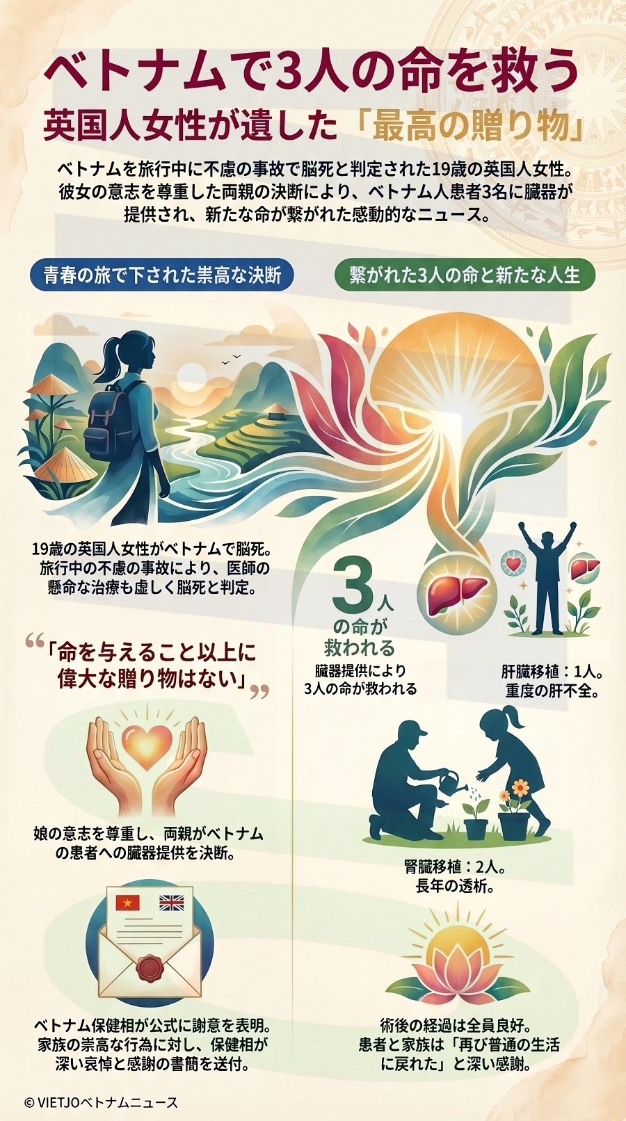 しかし、この若い女性のベトナムでの旅路はそこで終わらなかった。深い悲しみの中、彼女の両親は娘の臓器を、生死の境にあるベトナムの患者たちに提供することを決断したのだ。