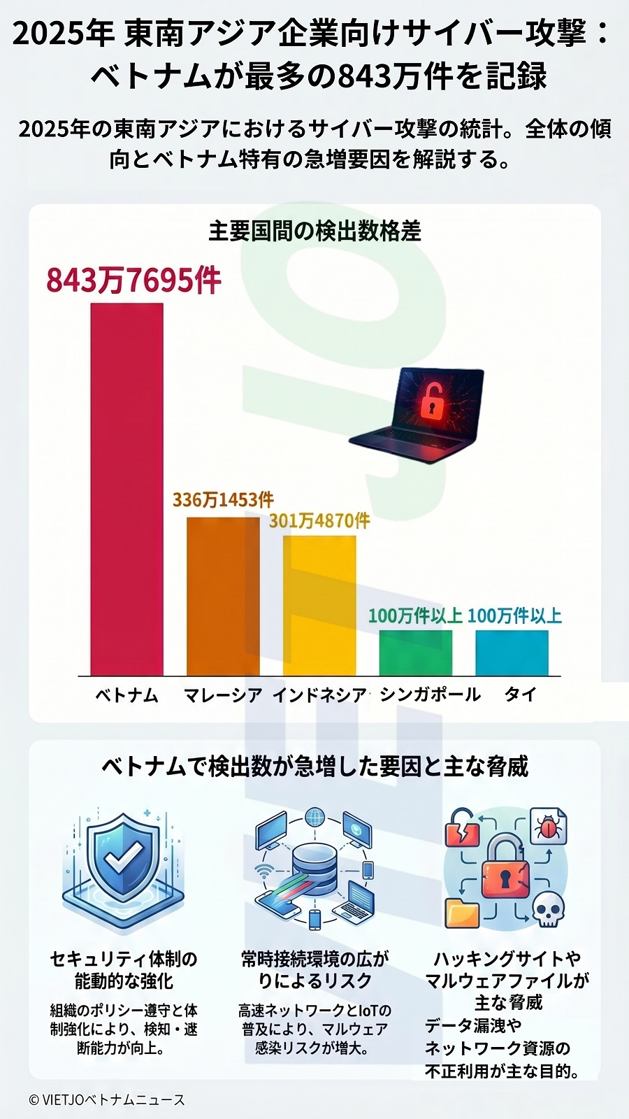 ベトナムに次いで攻撃件数が多かったのは、マレーシアの336万1453件とインドネシアの301万4870件だった。シンガポールとタイでも、それぞれ100万件以上の攻撃が確認されている。