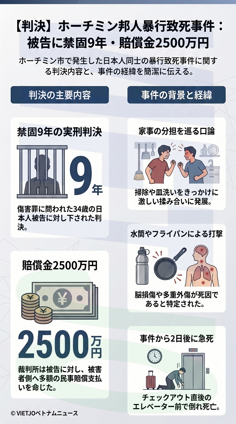 ホーチミン市人民裁判所は17日、同居していた日本人男性を殴って死亡させたとして、傷害罪に問われていた日本国籍のK・N被告(男・34歳)に対し、禁固9年の有罪判決を下した。