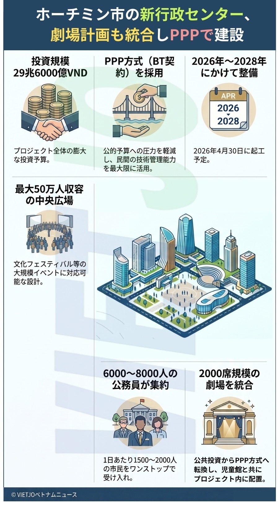 第11期(2026~2031年任期)ホーチミン市人民評議会はこのほど開催された第2回会議で、トゥーティエム新都市区における新行政センターおよび中央広場プロジェクトの投資方針を承認した。