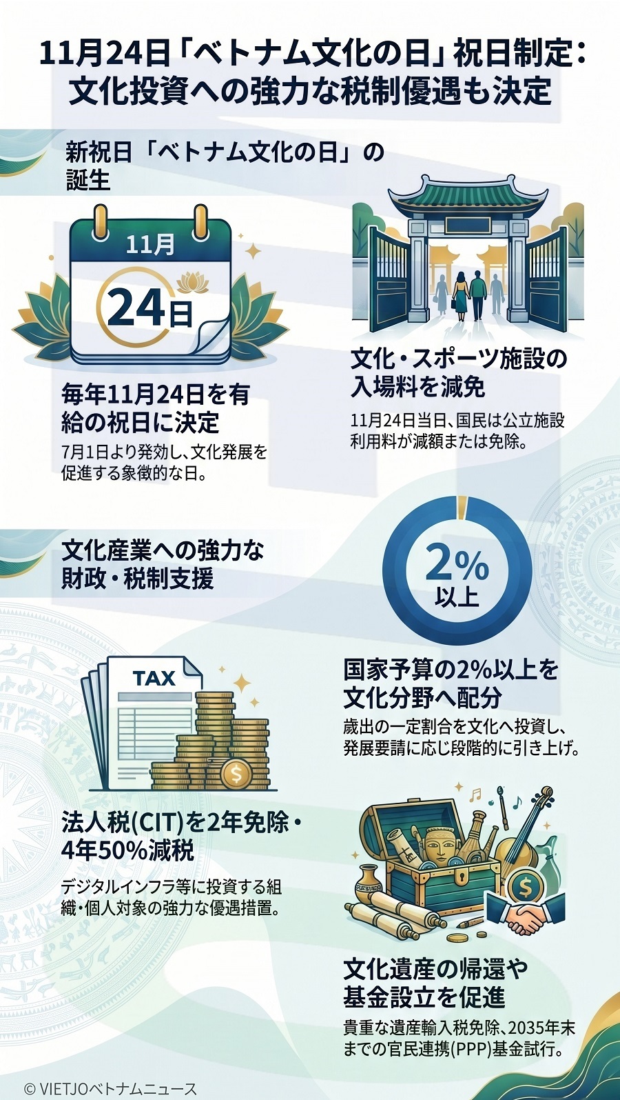 文化分野の株式や出資持分の譲渡などの所得に対するCITや個人所得税(PIT)も免除される。また、海外にある貴重な文化遺産を非営利目的でベトナムへ持ち帰る場合、輸入税などを免除し、付加価値税(VAT)を非課税とする。