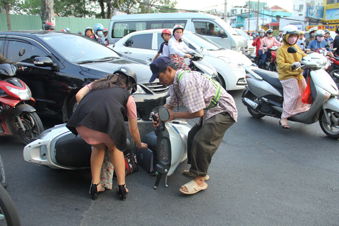 3月13日の帰宅ラッシュが始まる頃、1区チャンフンダオ(Tran Hung Dao)通りの歩道でバイクの修理道具を片付け、「出動」の準備をしているトアンさんの姿があった。「もう16時30分だからみんな帰り支度をしている頃だ。渋滞がひどくなる前に今すぐ行かないと!少しでも遅れると渋滞は夜まで続くからね」と、古い携帯電話の画面に表示された時刻を見ながらトアンさんは慌ただしく出発した。