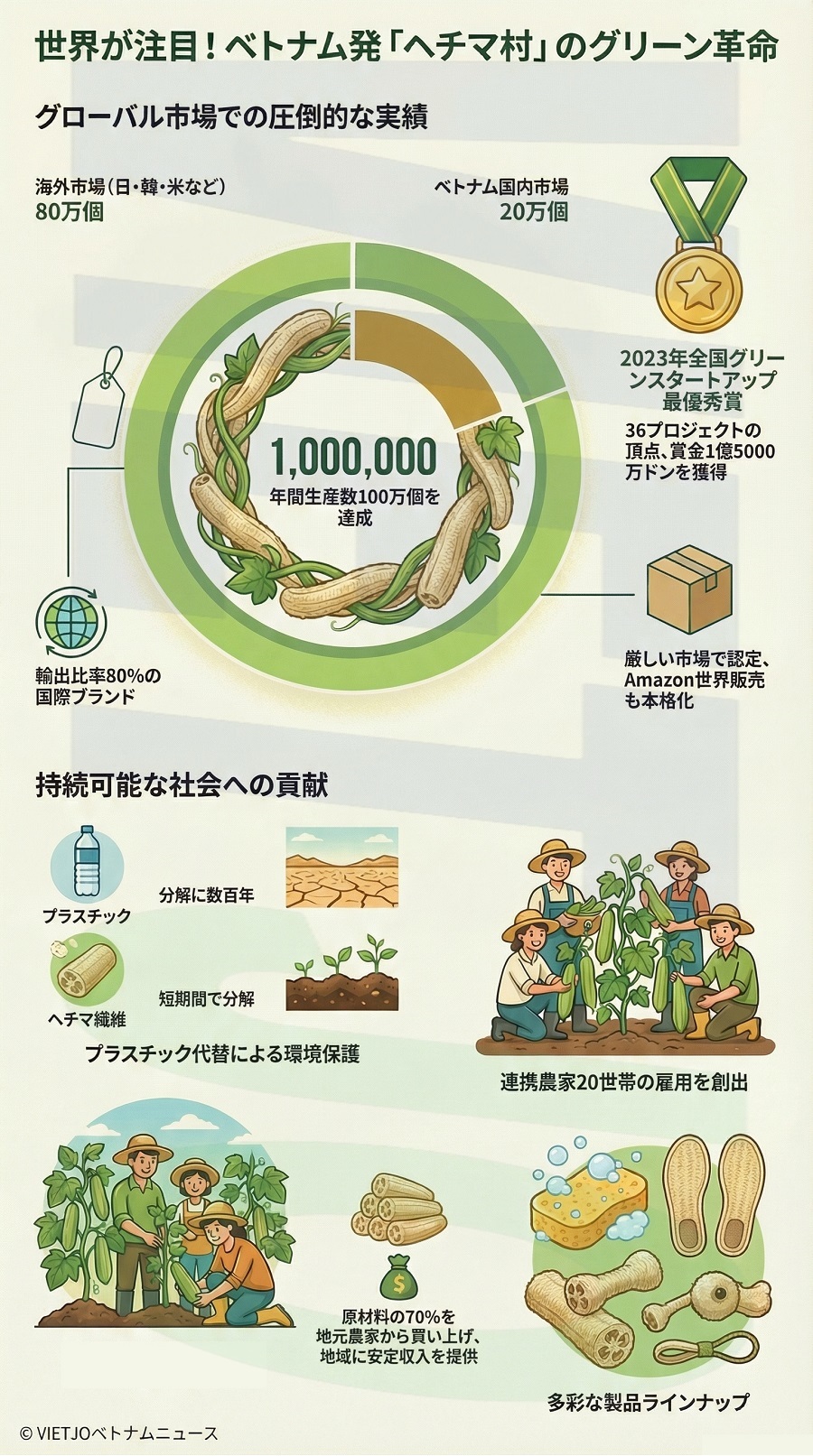 事業は社会的・環境的責任と両立でき、地域社会と地球に持続可能な価値を生み出せるというのがコアさんの信念だ。明確なビジョンと戦略的な歩みにより、「ヘチマ村」はベトナムのブランドを国際的な舞台へとさらに飛躍させている。