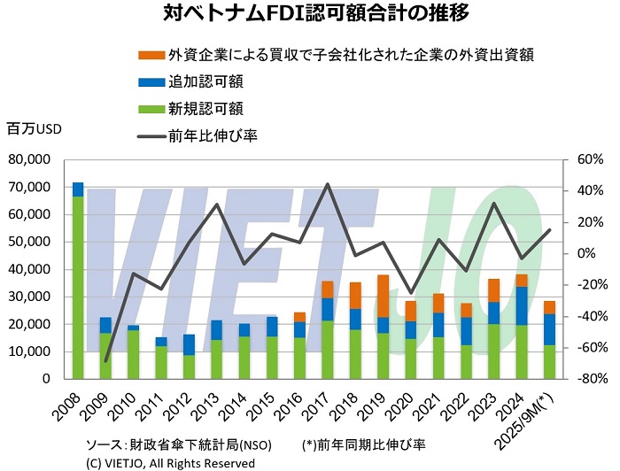 計画投資省海外投資局(FIA)が発表した海外直接投資(FDI)に関するデータによると、2025年1~9月期のFDI認可額(推定値)は前年同期比+15.2%増の285億4000万USD(約4兆3000億円)だった。