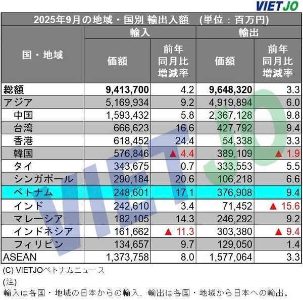 日本の財務省が発表した2025年9月の貿易統計(速報)によると、ベトナムの対日貿易収支は前年同月比▲2.8%減の1283億0700万円の黒字だった。