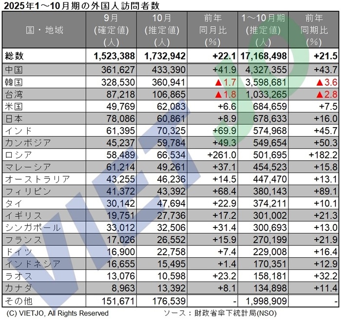 財政省傘下統計局(NSO)の発表によると、2025年10月の外国人訪問者数(推定値)は173万2942人で、前月比+13.8%増、前年同月比では+22.1%増加し、10月としては過去最高を記録した。