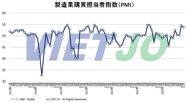 米国のS&Pグローバル(S&P Global)が発表した2025年11月のベトナム・PMI(製造業購買担当者指数)は53.8だった。