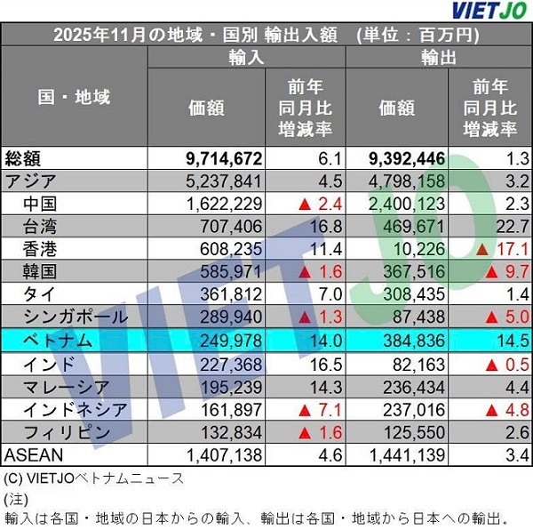 日本の財務省が発表した2025年11月の貿易統計(速報)によると、ベトナムの対日貿易収支は前年同月比+15.5%増の1348億5800万円の黒字だった。