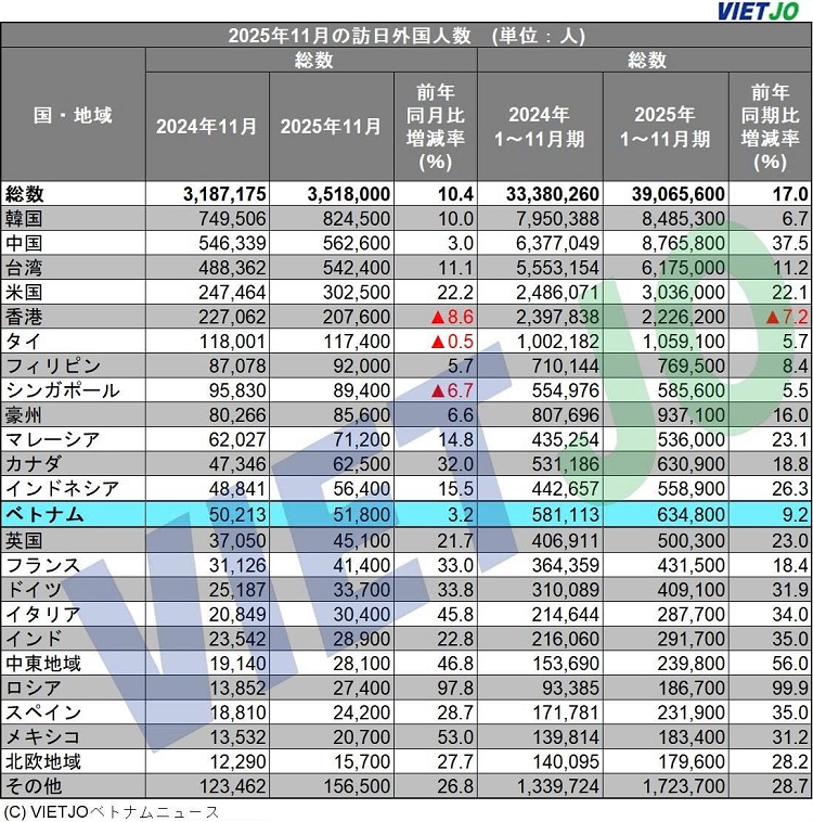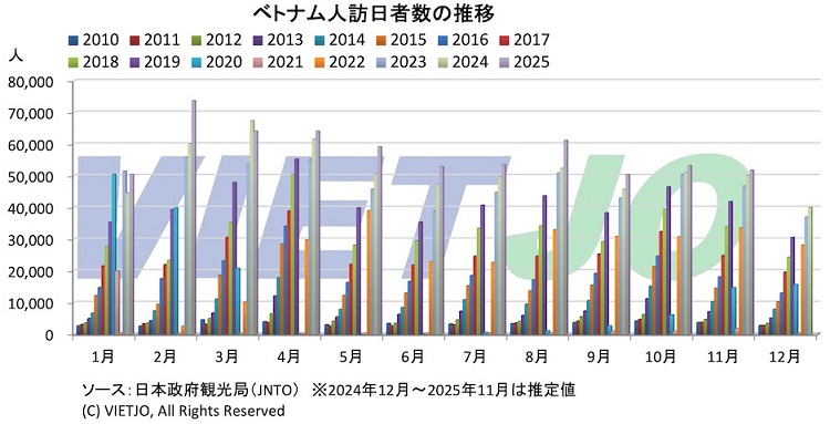 日本政府観光局(JNTO)が発表した統計によると、2025年11月の訪日ベトナム人の数は前年同月比+3.2%増の5万1800人で、11月として過去最高を記録するとともに、8か月連続で単月の過去最高を更新した。