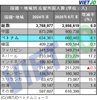 日本の法務省出入国在留管理庁が発表した2025年6月末時点における在留外国人数に関する統計によると、同時点の日本における在留ベトナム人数は66万0483人で、2024年末時点と比べて+4.1%増加し、過去最高を更新した。