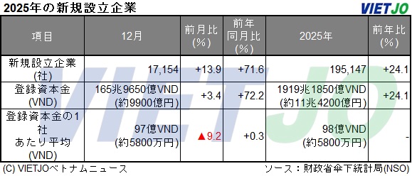 財政省傘下統計局(NSO)が発表したデータによると、2025年に全国で新規設立された企業は前年比+24.1%増の19万5147社、登録資本金の合計は同+24.1%増の1919兆1850億VND(約11兆4200億円)だった。同期における1社当たりの登録資本金の平均は前年と同じく98億VND(約5800万円)だった。