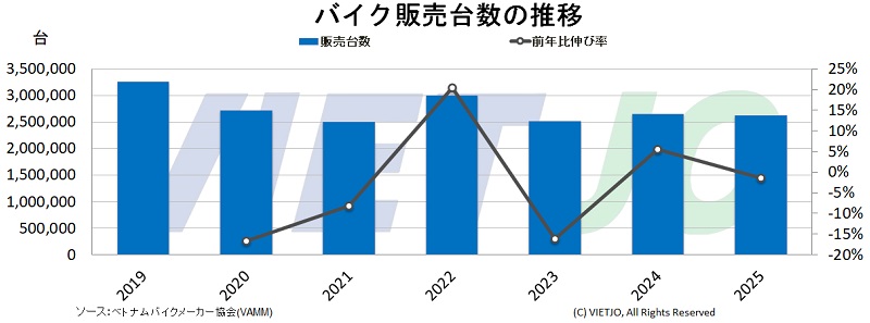 ベトナムバイクメーカー協会(VAMM)の発表によると、2025年におけるVAMM加盟5社のバイク販売台数は前年比▲1.5%減の261万5057台だった。