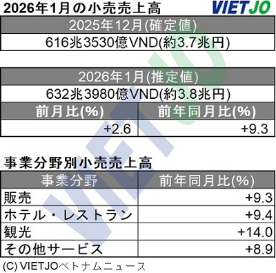 財政省傘下統計局(NSO)の発表によると、2026年1月の小売売上高(推定値)は前月比で+2.6%増、前年同月比では+9.3%増の632兆3980億VND(約3兆8000億円)だった。
