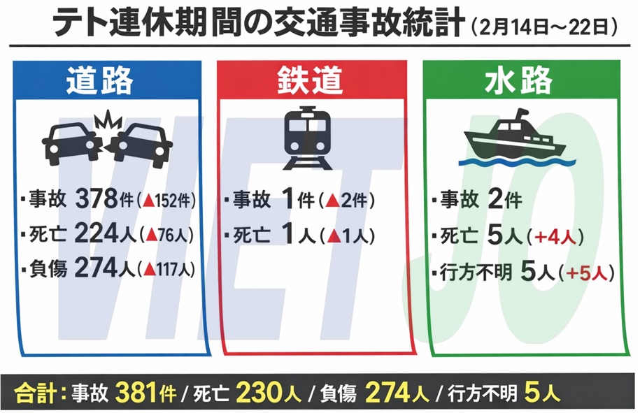公安省傘下の交通警察局によると、テト(旧正月)に伴う2月14日~22日の9連休中に全国で発生した交通事故件数は前年同期比▲28.79%(▲154件)減の381件、死亡者数は同▲23.2%(▲73人)減の230人、負傷者数は同▲30.10%(▲118人)減の274人だった。