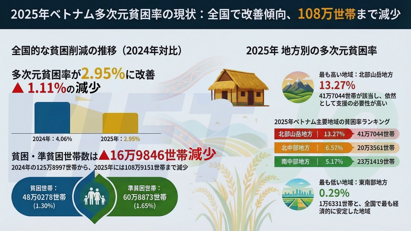 なお、2024年の調査結果では、全国の多次元貧困率は4.06%、貧困・準貧困世帯数は125万8997世帯だった。地方別に見ると、多次元貧困率が最も高かったのは北部山岳地方の14.98%(48万6623世帯)、最も低かったのは東南部地方の0.15%(7585世帯)となっており、2025年は前年に比べ全国的に貧困状況が改善したことがうかがえる。