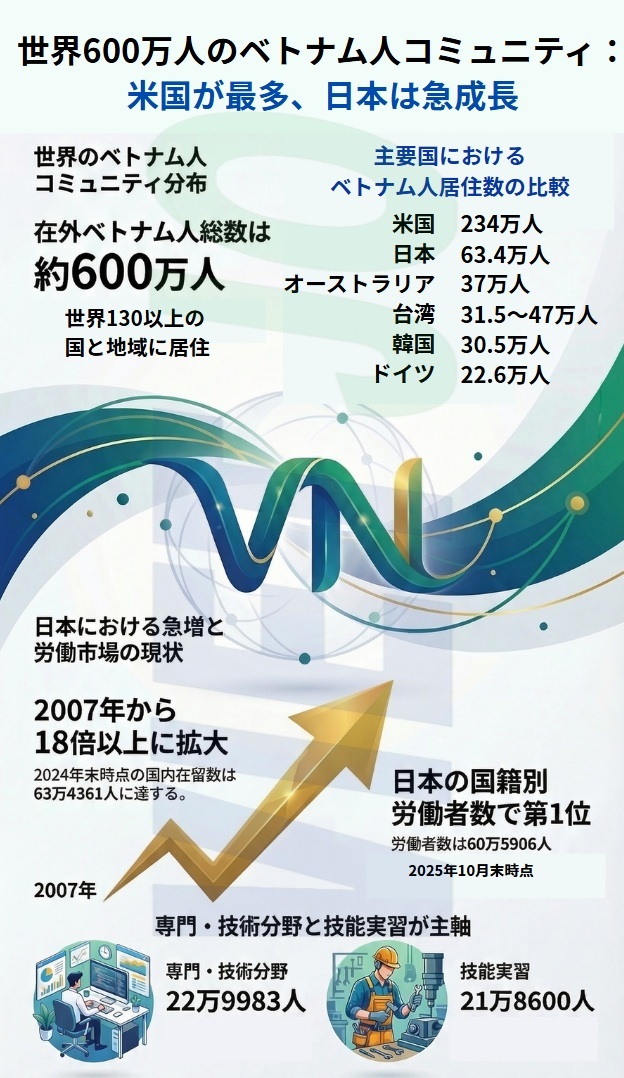 在外ベトナム人国家委員会(SCOV)によると、現在、世界130以上の国と地域に約600万人の在外ベトナム人が生活や学習の拠点として暮らしている。米国が依然として最大のコミュニティを形成している一方、日本をはじめとするアジア諸国での増加も顕著となっている。