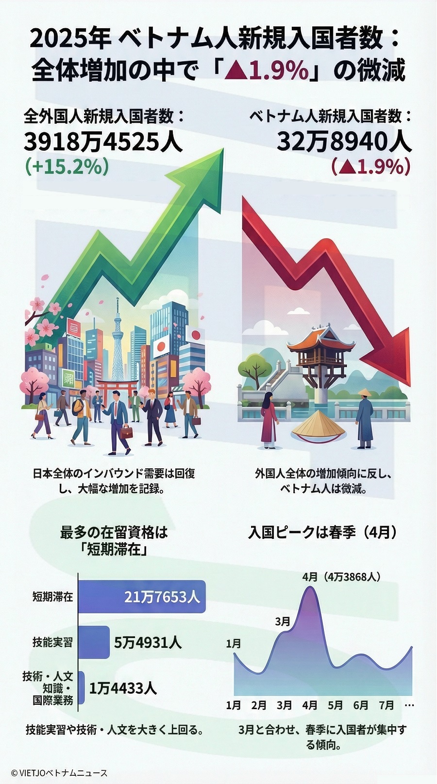 日本の法務省出入国在留管理庁が発表した2025年における外国人入国者数及び日本人出国者数等に関する統計によると、同年の日本におけるベトナム人新規入国者数は前年比▲1.9%減の32万8940人だった。全体の外国人新規入国者数が前年比+15.2%増の3918万4525人と増加する中、ベトナム人入国者数は微減となった。