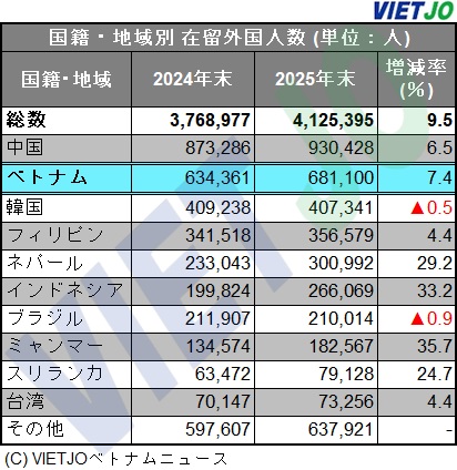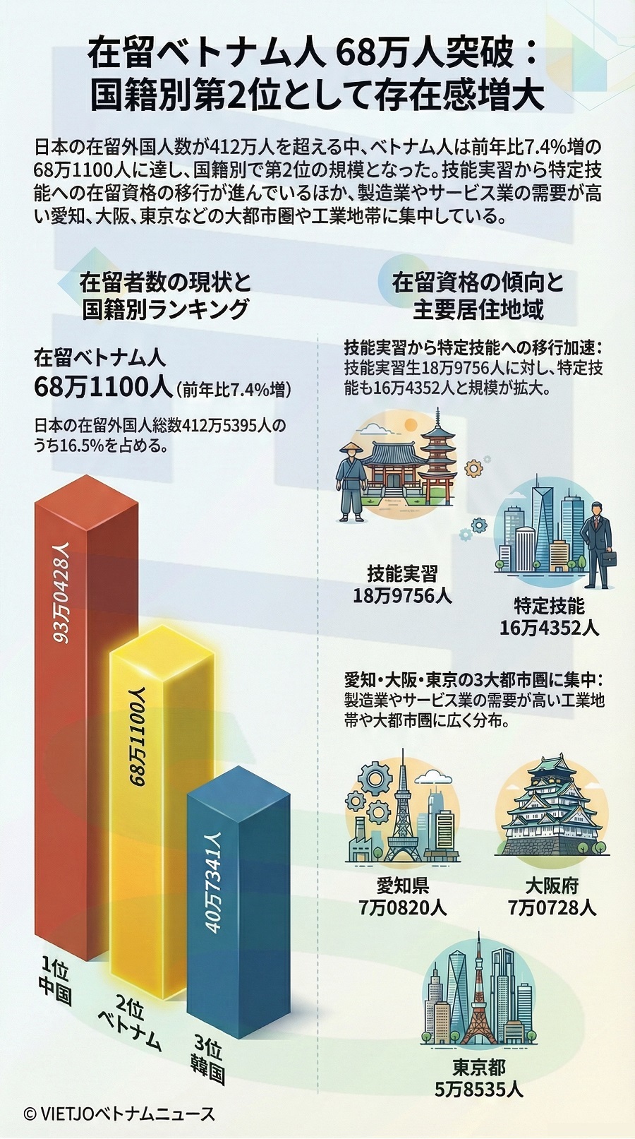 日本の法務省出入国在留管理庁が発表した統計によると、2025年末時点の日本における在留外国人数は過去最高を更新し、その中で在留ベトナム人数は68万人を超えて国籍・地域別で第2位となった。在留資格別では技能実習や特定技能が多くを占めており、都道府県別では愛知県や大阪府などの大都市圏に多く居住していることが明らかになった。