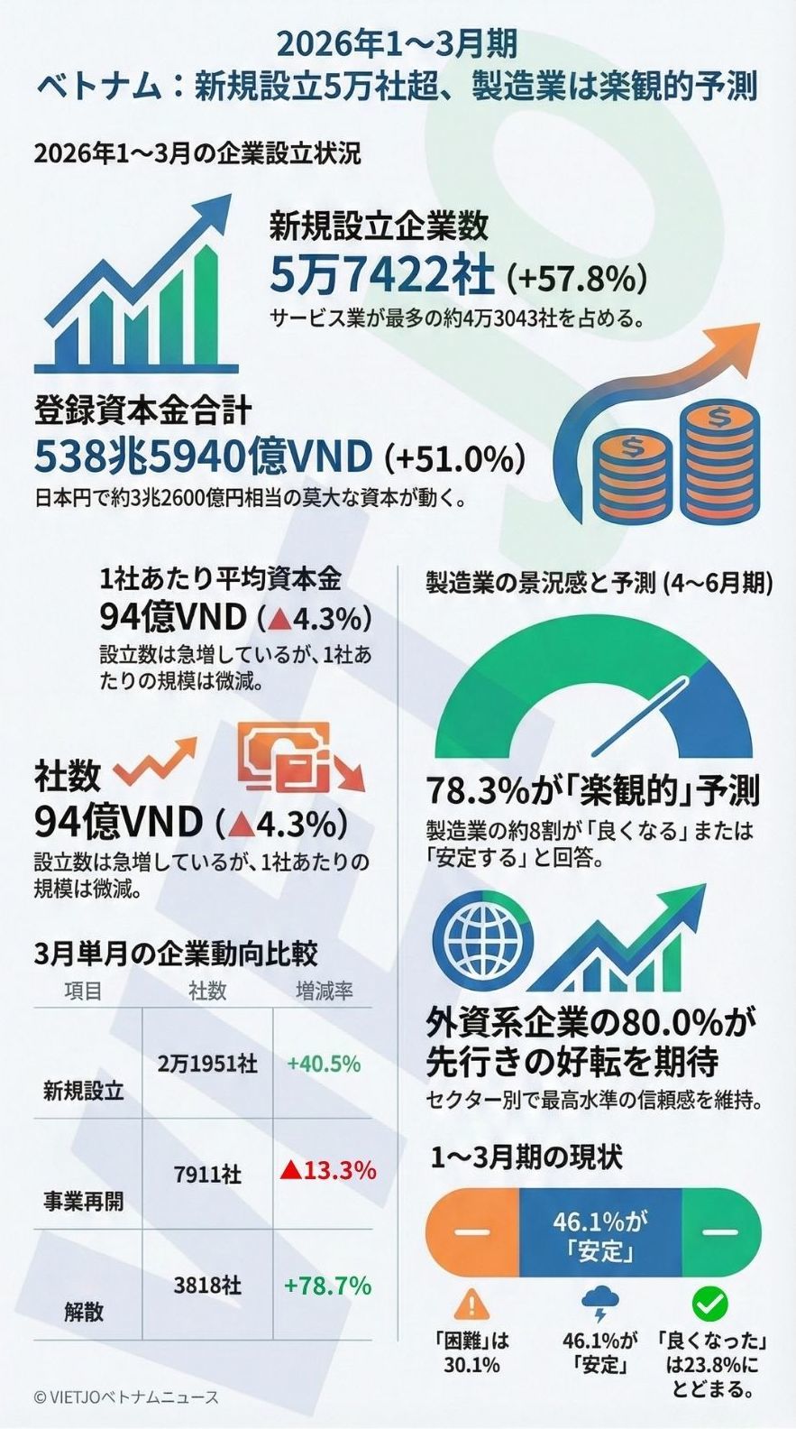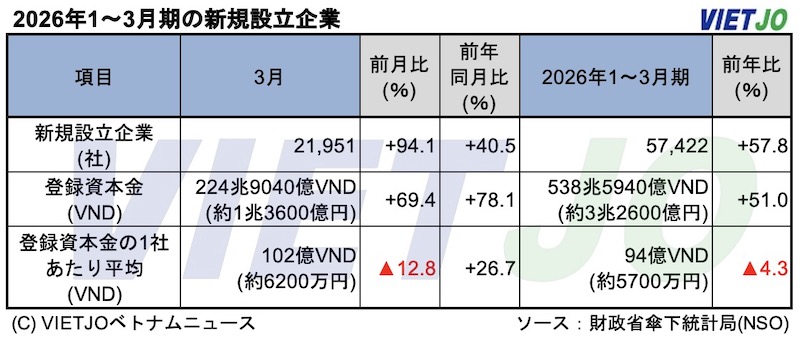財政省傘下統計局(NSO)が発表したデータによると、2026年1~3月期に新規設立された企業は前年同期比+57.8%増の5万7422社、登録資本金の合計は同+51.0%増の538兆5940億VND(約3兆2600億円)だった。1社当たりの登録資本金の平均は前年同期比▲4.3%減の94億VND(約5700万円)となった。