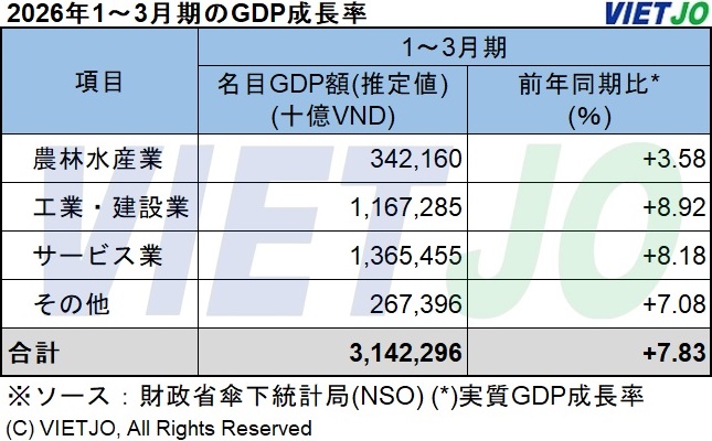 財政省傘下統計局(NSO)の発表によると、2026年1~3月期の国内総生産(GDP)成長率(推定値)は前年同期比+7.83%増となり、前年同期の+7.07%を上回る力強い伸びを記録した。同期としては2009年以降で最も高い伸びとなり、近年の中でも際立った成長水準に達した。