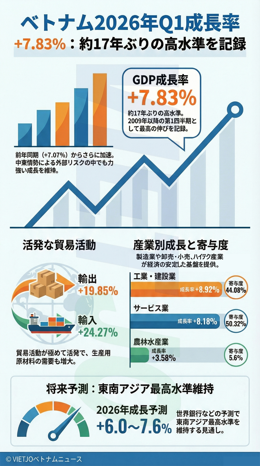工業・建設業では、製造業が+9.73%増と大きく伸びて全体の原動力となったほか、公共投資の早期実行やインフラ建設の推進を背景に建設業も+8.36%増と好調だった。一方、サービス業はテト(旧正月)の消費拡大や外国人観光客の増加の恩恵を受けた。卸売・小売業が+9.62%増、運輸・倉庫が+8.95%増といずれも高い成長率を示した。また、農林水産業も、ハイテク技術を導入した水産業が+4.51%増となるなど、経済の安定的な基盤としての役割を果たした。