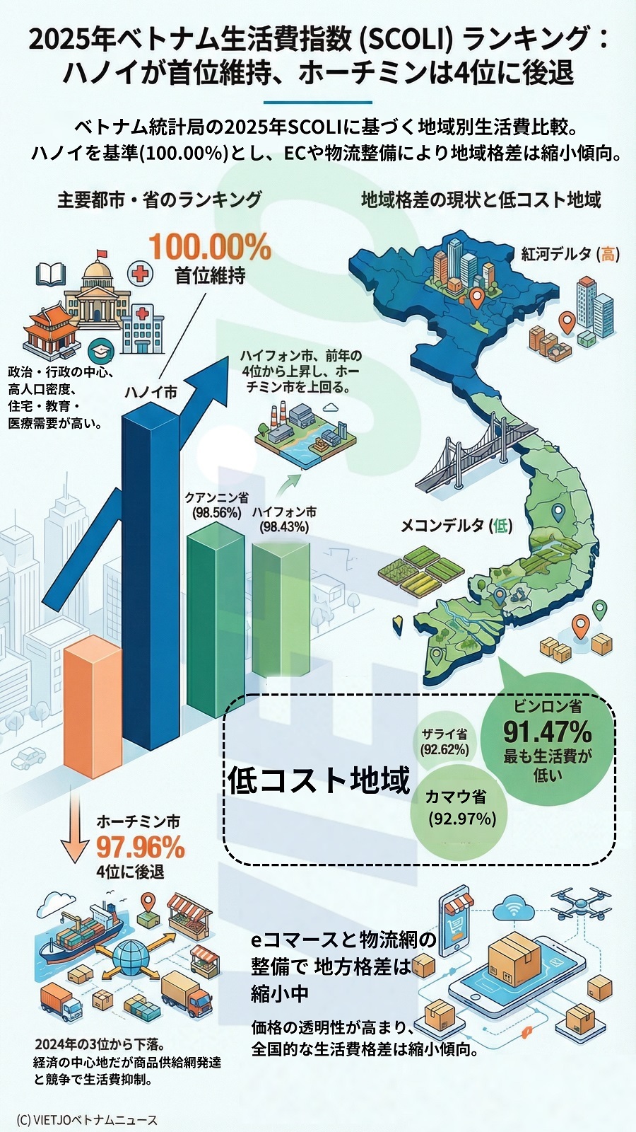 2025年の生活費指数トップ5は、◇1位:ハノイ市(100.00%)、◇2位:東北部地方クアンニン省(98.56%)、◇3位:北部紅河デルタ地方ハイフォン市(98.43%)、◇4位:ホーチミン市(97.96%)、◇5位:南中部地方ダナン市(97.89%)だった。