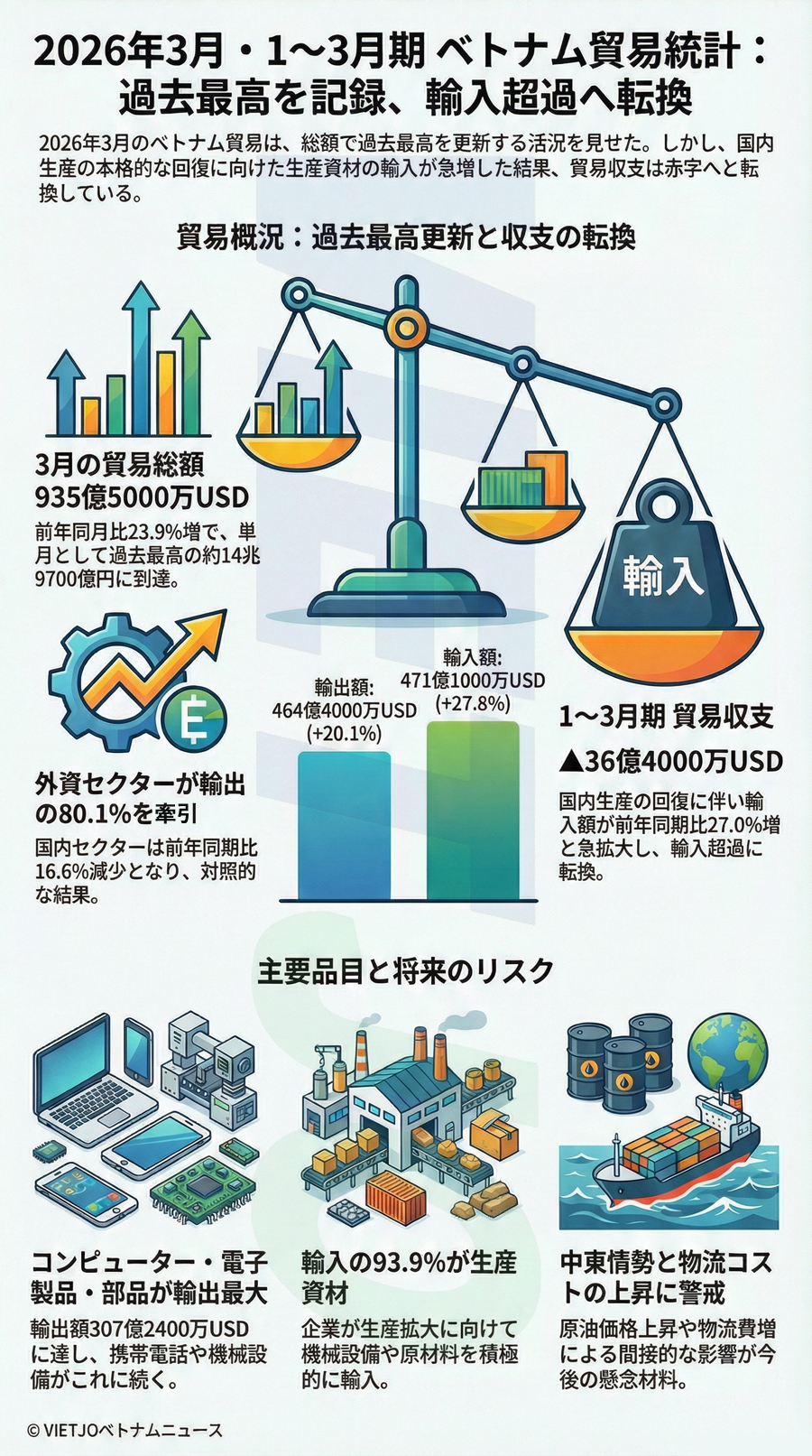 3月の輸出入総額は前月比+39.2%増、前年同月比+23.9%増の935億5000万USD(約14兆9700億円)に達し、単月として過去最高を記録した。内訳は、輸出額が同+20.1%増の464億4000万USD(約7兆4300億円)、輸入額が同+27.8%増の471億1000万USD(約7兆5400億円)だった。