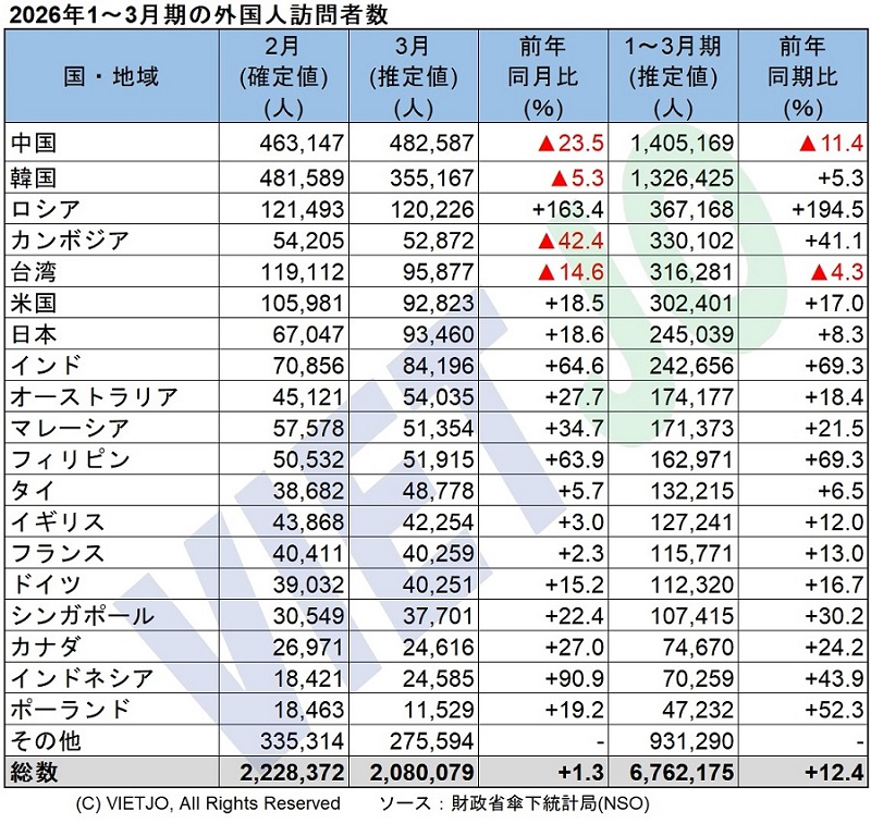 これにより、2026年1~3月期の外国人訪問者数は前年同期比+12.4%増の676万2175人に達し、1~3月期として過去最高を記録した。