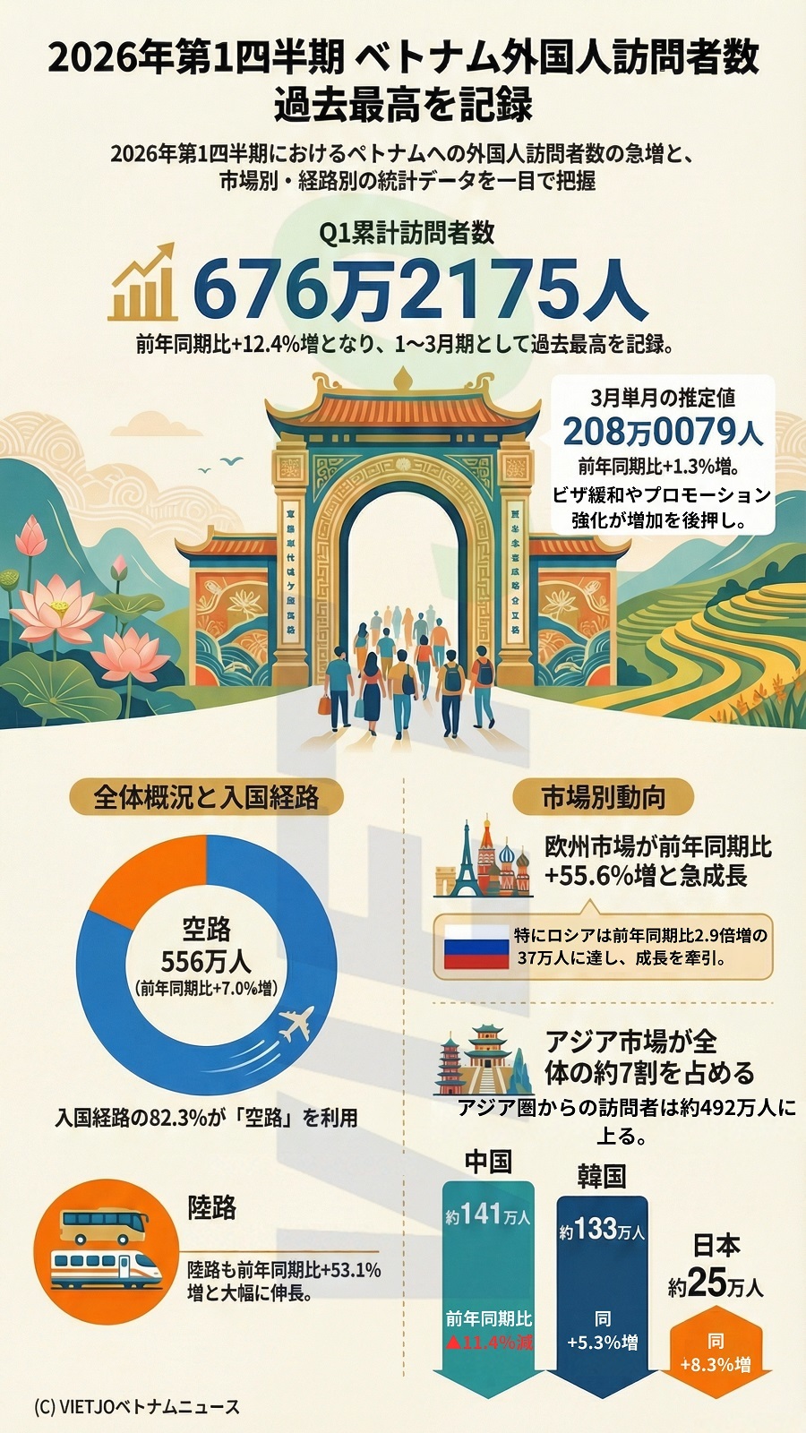 1~3月期の入国経路別では、空路による訪問者数が約556万人で全体の82.3%を占め、前年同期比+7.0%増となった。陸路は同+53.1%増、海路は同+11.4%増だった。