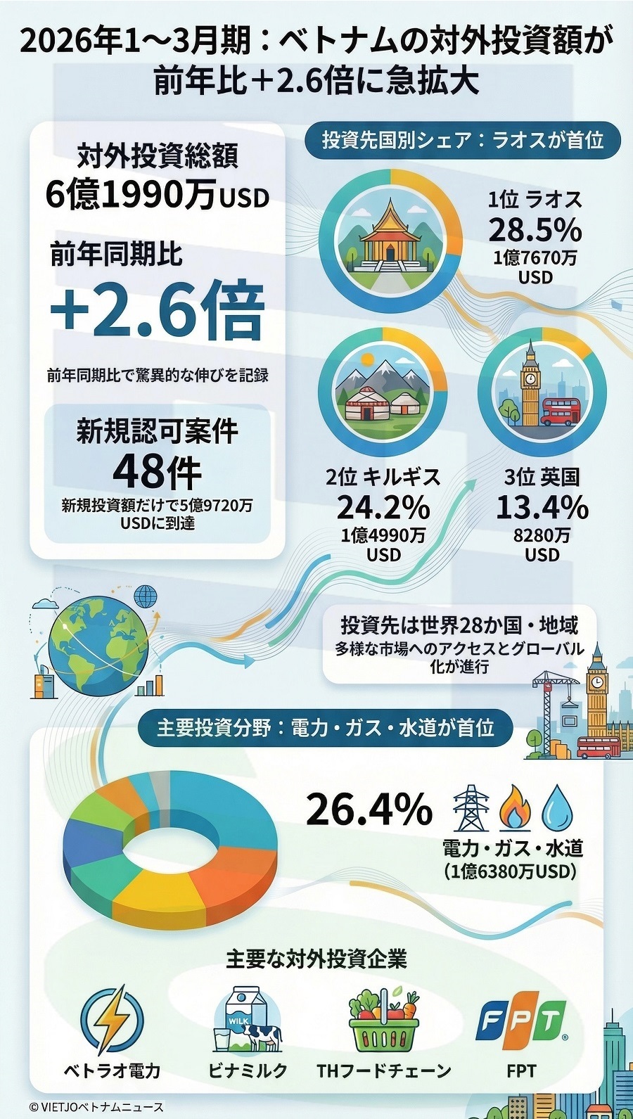 投資先の国・地域別では、ラオスが1億7670万USD(約280億円)で全体の28.5%を占め、トップに立った。続いて、キルギスが1億4990万USD(約240億円)、英国が8280万USD(約132億円)、アンゴラが3000万USD(約47億7000万円)などの順となっている。1~3月期にベトナムが投資を行った国・地域は28か所に上った。