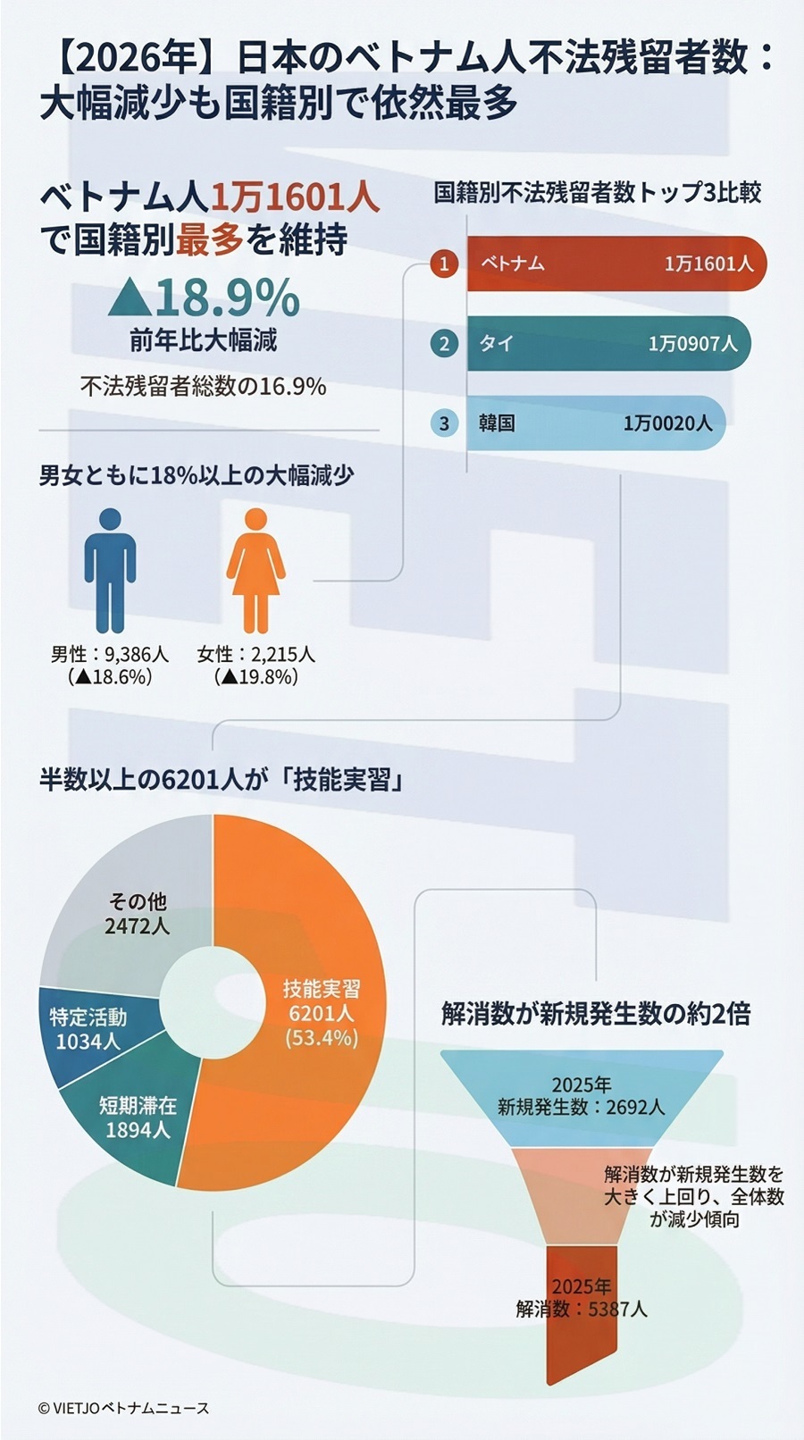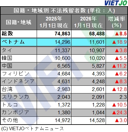 日本の法務省出入国在留管理庁が発表した2026年1月1日時点における日本の不法残留者数に関する統計によると、ベトナム人は1万1601人となり、前年1月1日時点から▲18.9%減少した。不法残留者総数に占めるベトナム人の割合は16.9%で、国籍別で引き続き最多となっている。