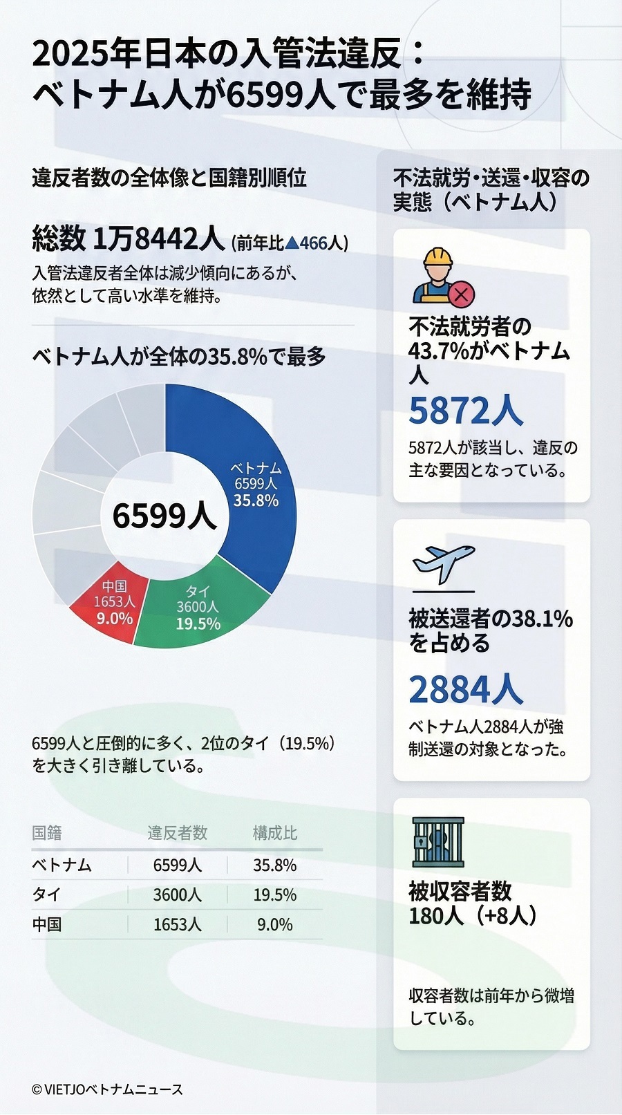 日本の法務省入国管理局が発表した2025年における出入国管理及び難民認定法(入管法)違反事件に関する統計によると、同年に入管法違反により退去強制手続きまたは出国命令手続きを執ったベトナム人の数は前年比▲397人減の6599人(うち男性5405人)に上り、全体の35.8%を占めて国籍別で引き続き最多となった。