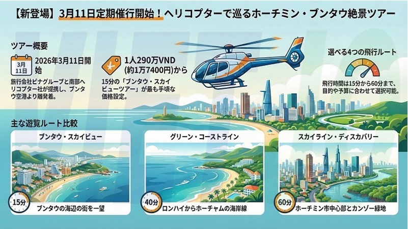 ホーチミン市観光局は6日、ヘリコプター遊覧ツアーを実施する各企業の提携調印式で、3月11日から定期ツアーを催行すると発表した。