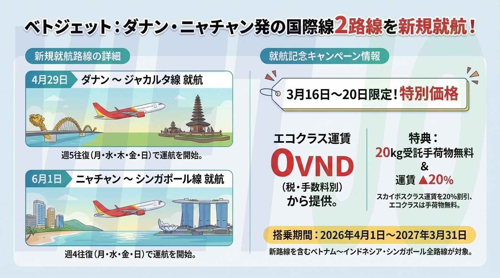 新路線の就航を記念して、同社は3月16日から20日まで、ベトナムとシンガポールおよびインドネシアを結ぶ全路線を対象としたキャンペーンを実施する。