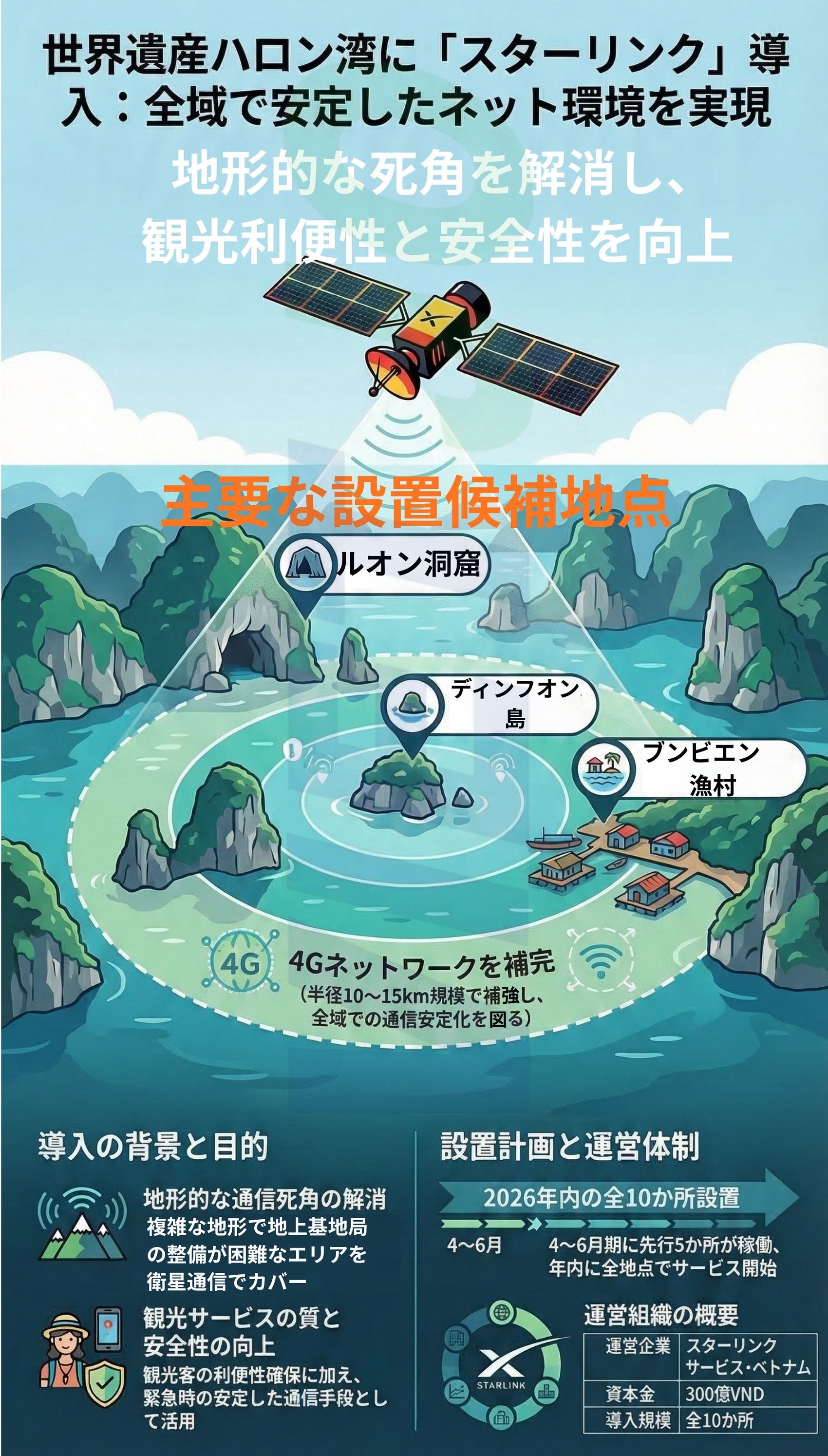 東北部地方クアンニン省は、世界自然遺産であるハロン湾において電波が不安定なエリアをカバーし、観光客の利便性向上と安定した通信接続を確保するため、低軌道衛星通信インターネットアクセスサービス「スターリンク(Starlink)」のアクセスポイント10か所を展開する。