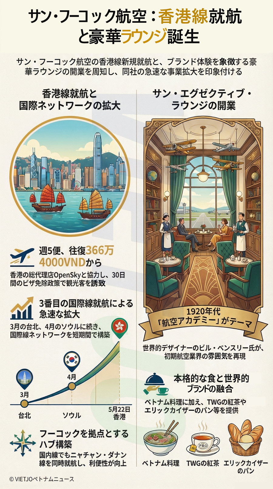 観光不動産開発を中核とする地場系コングロマリット(複合企業)サングループ(Sun Group)傘下のサン・フーコック・エアウェイズ(Sun PhuQuoc Airways=SPA)は1日、南部メコンデルタ地方アンザン省のフーコック国際空港でビジネスクラスラウンジ「サン・エグゼクティブ・ラウンジ(Sun Executive Lounge)」を開業した。また、翌2日にはフーコックと香港を結ぶ新路線の航空券の販売を開始した。