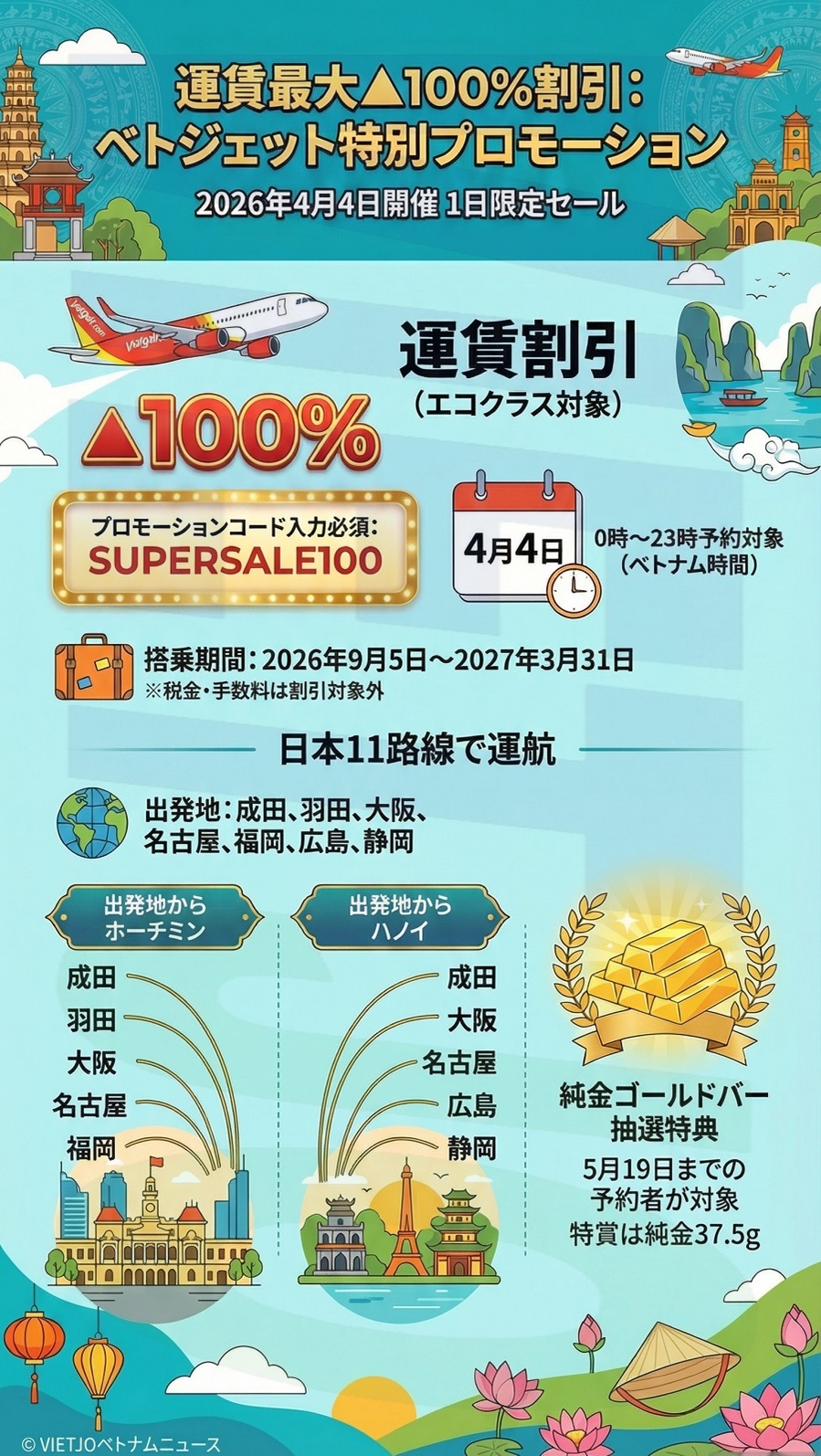 4月4日のベトナム時間0時から23時までの間に、同社ウェブサイトまたは公式アプリ「Vietjet Air」を通じてエコクラスの航空券を予約する際、プロモーションコード「SUPERSALE100」を入力すると、運賃が最大100%割引となる。対象は同社が運航する全ての路線で、搭乗期間は2026年9月5日から2027年3月31日までとなっている。