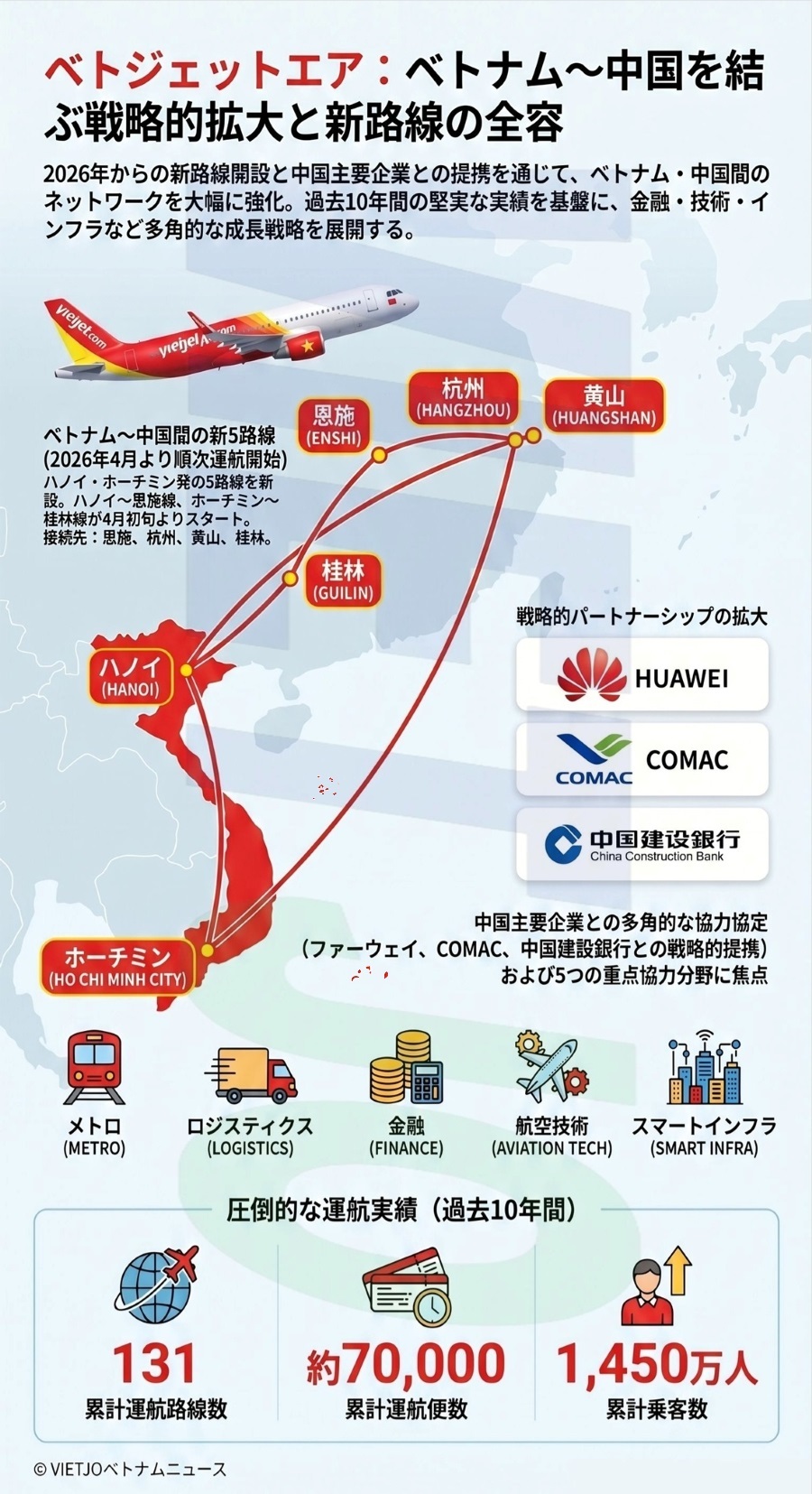 トー・ラム書記長 兼 国家主席の中国公式訪問に合わせ、地場系コングロマリット(複合企業)のソビコ・グループ(SOVICO Group)および国内最大手の格安航空会社(LCC)ベトジェットエア[VJC](Vietjet Air)は16日、中国・北京で投資協力会議を開催した。ベトジェットエアはこの席で、ベトナムと中国を結ぶ新たな5路線を発表した。