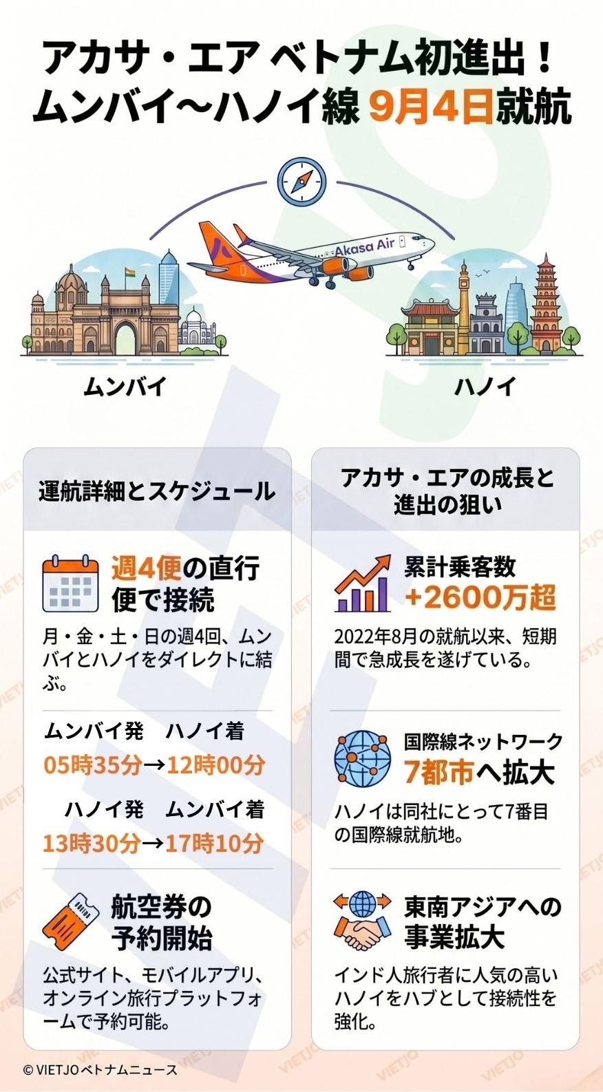 同路線は直行便で、週4便(月・金・土・日)の運航となる。出発時刻はいずれも現地時間で、ムンバイ発便が5時35分(12時00分ハノイ着)、ハノイ発便が13時30分(17時10分ムンバイ着)となる。
