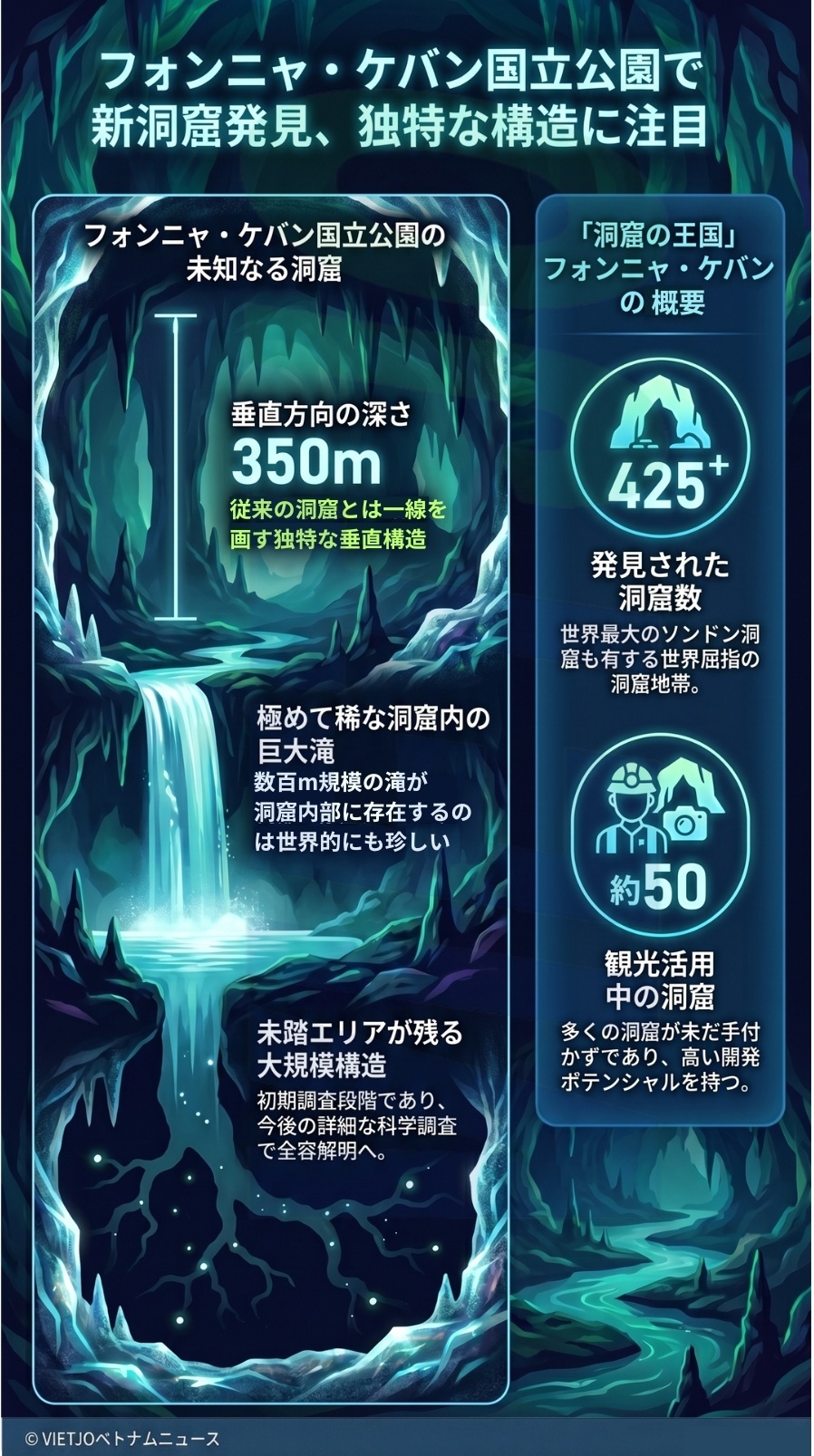 同公園のコアゾーンには、大規模な地下河川システムを有する世界最大の洞窟であるソンドン洞窟も位置している。専門家によると、この地域に点在する多くの洞窟で地下水流の兆候が確認されているものの、洞窟の内部に高さ数百m規模の滝が形成される現象は極めてまれだ。今回の新発見は、世界遺産である同公園の地質学的および景観的な価値をさらに高めるものとして大きな注目を集めている。