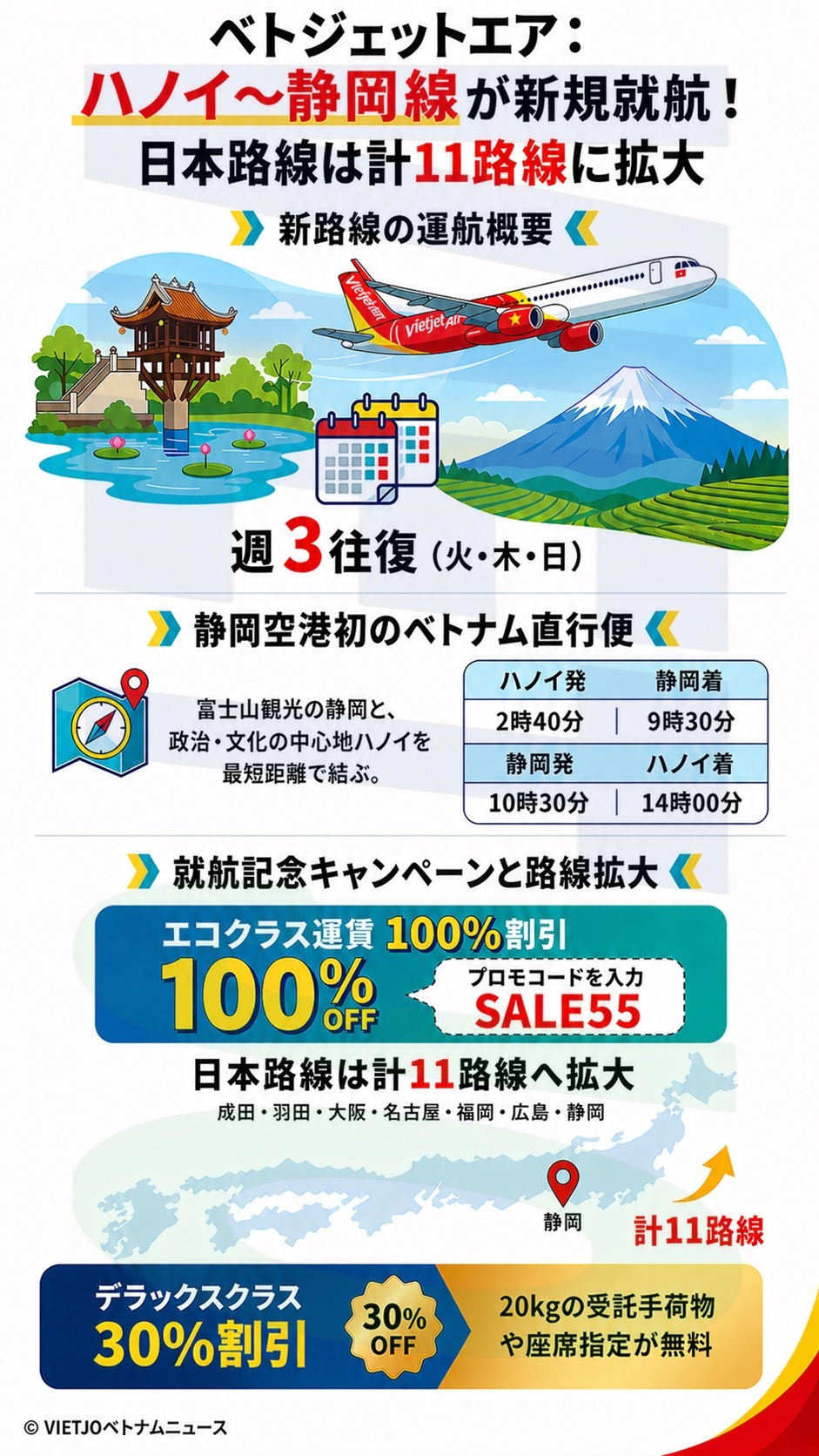 ベトジェットエアは、◇ホーチミン~成田/羽田/大阪/名古屋/福岡線、◇ハノイ~成田/大阪/名古屋/福岡/広島線の計10路線を運航しており、今回の静岡線の就航により、同社のベトナム~日本路線は計11路線に拡大した。