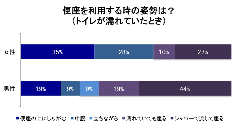 便座に足跡がつくということは、当たり前ですが便座に足をのせて用を足しているということです。それでは、日頃から便座にしゃがんで用を足している人がどのくらいいるかというと、男性で9%、女性で11%という結果でした。洋式トイレにも関わらずしゃがんで用を足す人がいるのは日本人にとって驚きですが、思ったほど多くはない印象です。