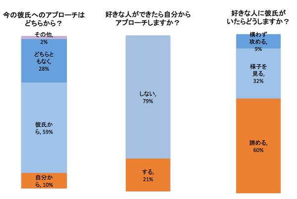 「好きな人ができたら自分から積極的にアプローチをする」と回答したのは全体の21%で、「今の彼氏へのアプローチも自分からした」という人は10%に過ぎません。