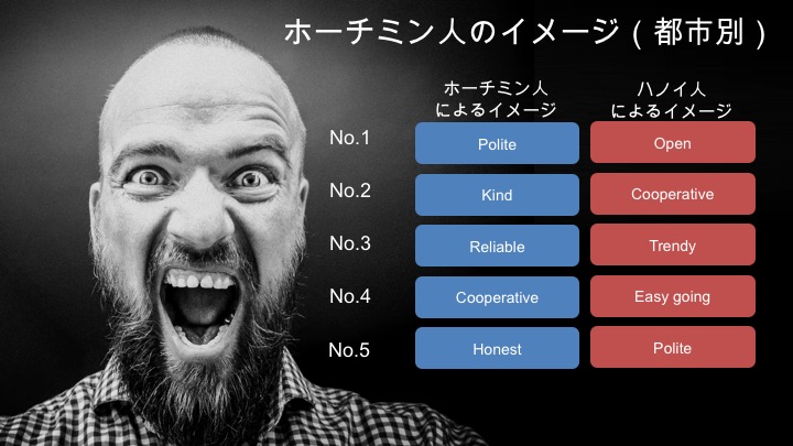 一方で、 ハノイ人は自分たちを「親切で協力的で真面目な性格」と考えている のに対して、 ホーチミン人はハノイ人を「賢くて真面目だけど、神経質で悲観的」と捉えている ことがデータからわかります。どちらの人々もそれぞれに対して少し否定的に考えている点が特長です。
