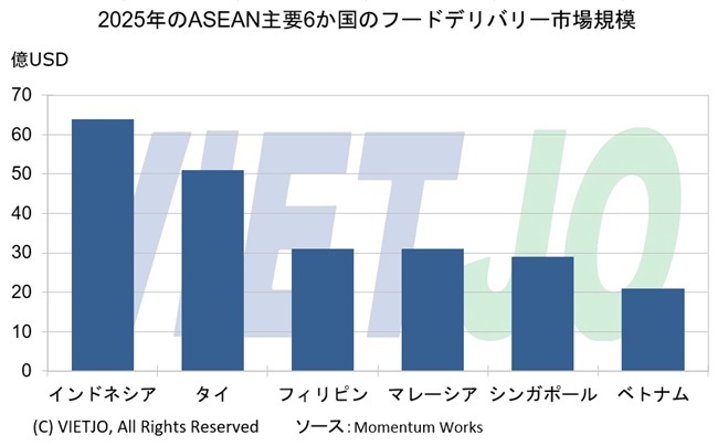 シンガポール系調査会社モメンタム・ワークス(Momentum Works)はこのほど、2025年における東南アジアの主要6か国(インドネシア、タイ、シンガポール、フィリピン、マレーシア、ベトナム)のフードデリバリー市場に関する年次レポートを発表した。