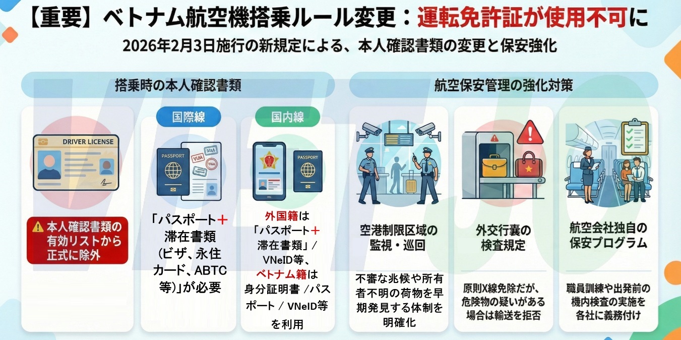 ベトナム航空保安プログラムおよび航空保安に関する品質管理の詳細を規定する公安省の通達第14号/2026/TT-BCAが2月3日に施行された。これにより、ベトナム人旅客は国内線の搭乗手続きの際に、身分証明書として...