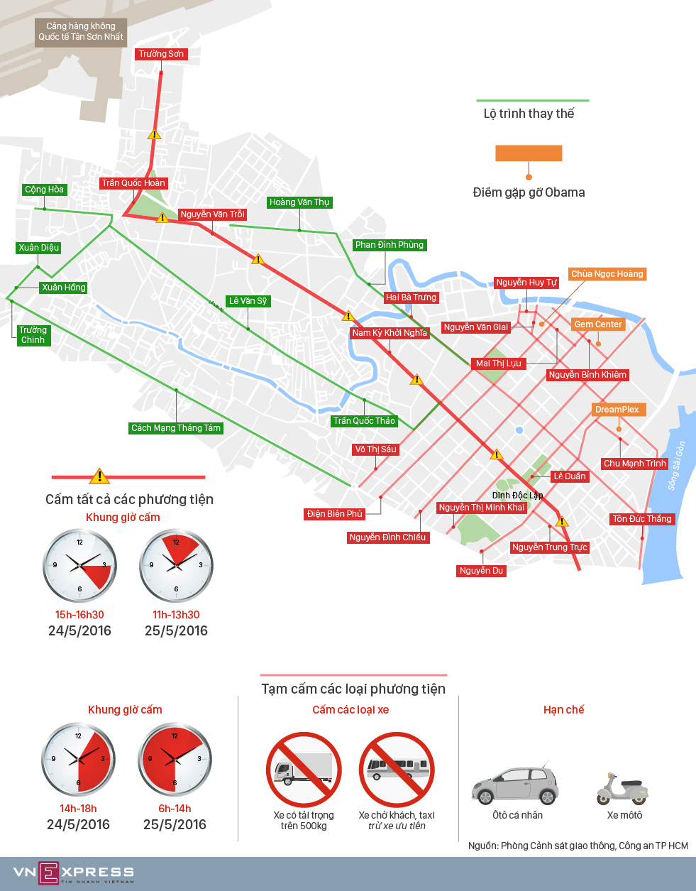 ベトナムを公式訪問中のバラク・オバマ米大統領が、24日15 時頃から25日12時頃までホーチミン市に滞在する。これに伴い、24日の15時から16時30分までと25日の11時30分から13時30分まで、ホーチミン市内中心部とタンソンニャット国際空港を結ぶグエンバンチョイ(Nguyen Van Troi)通りとナムキーコイギア(Nam Ky Khoi Nghia)通りが全車両通行禁止となる。